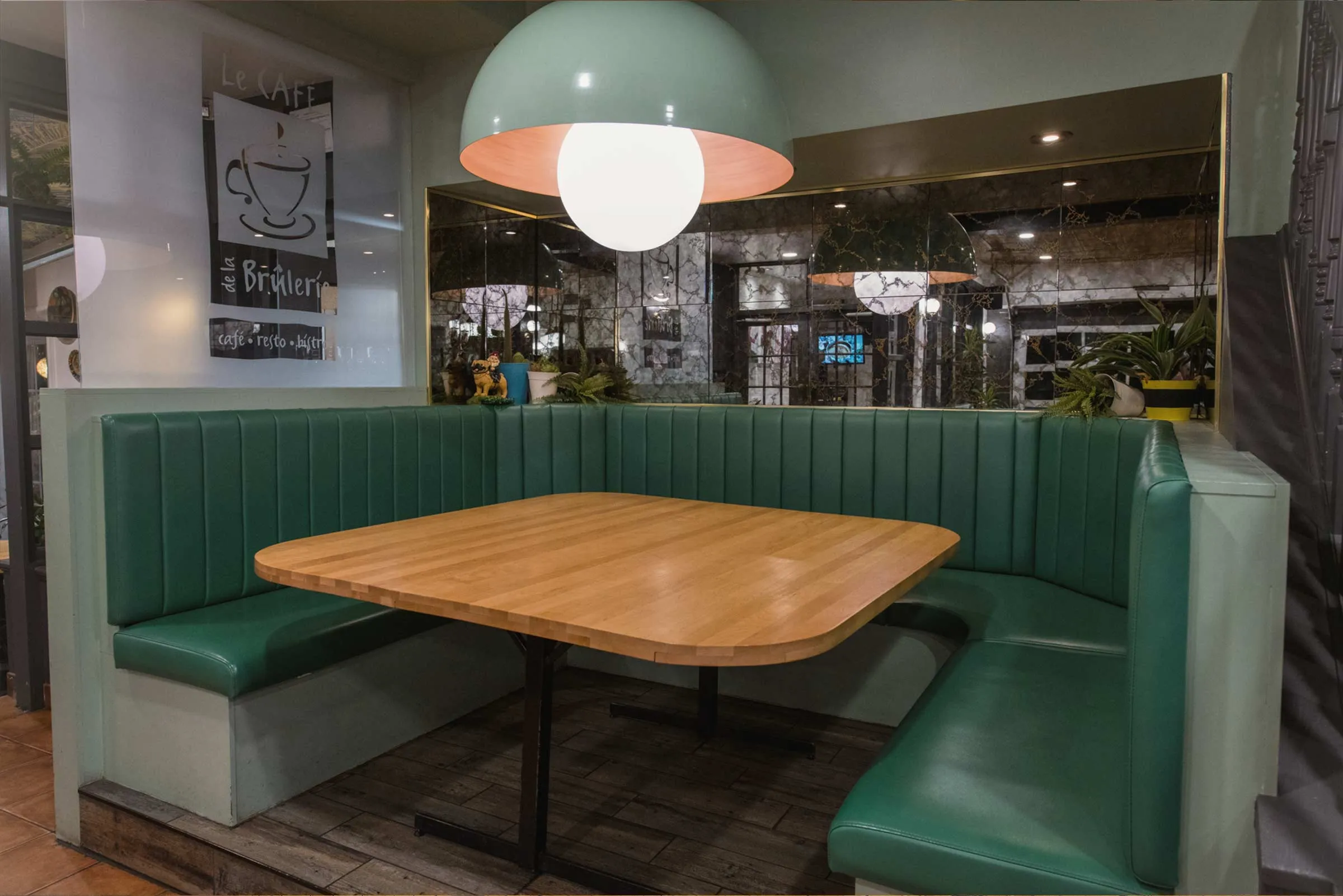 Pour ce restaurant et brûlerie de plus de 4000 pi² à Granby, Marron Design a accompagné les propriétaires dans une rénovation complète de l’espace intérieur. L’objectif était de rafraîchir la décoration et de réaménager les zones de banquettes afin de répondre à la diversité des besoins : rassemblements, travail, jeux entre amis ou moments plus intimes. La mission incluait aussi le relooking de l’espace de torréfaction, afin qu’il reflète mieux l’identité chaleureuse et familiale du lieu.
